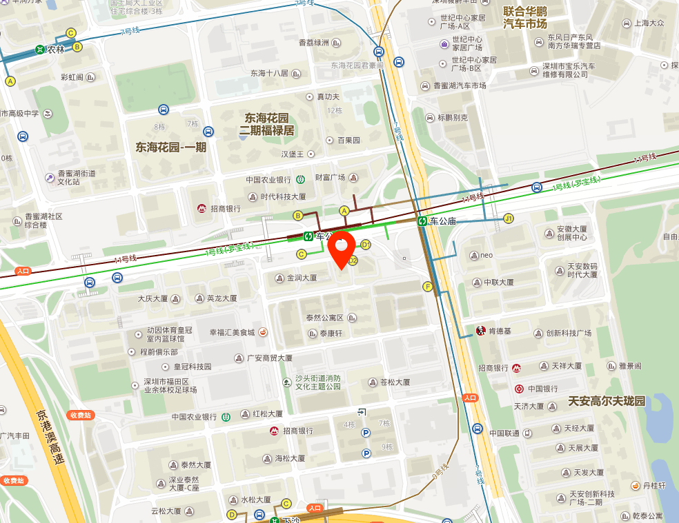附近的地铁站: 距离地铁1、7、9、11号线的换乘站--车公庙站约120米 附近的公交站: 招商银行大厦① - 公交站141米; 途经公交车: 21路 101路 113路 222路 223路 303路 H220路 M102路 M213路 M392路 M447路 M448路 N4路 N6路 高峰专线119路 高峰专线62路 高快巴士31路 观光巴士城市夜景黄线 观光巴士科技生态蓝线 喜年中心 - 公交站243米;途经公交车: 26路 招商银行大厦② - 公交站348米; 途经公交车: 324路 326路 M392路 M413路 M447路 M447区间线 M559路 N4路 高峰专线18路 高峰专线221号 高快巴士31路 高快巴士47号 高快巴士60号 天安数码城 - 公交站403米; 途经公交车: 26路 63路 64路 71路 215路 303路 E12路 E1路 E37路 E6路 H220路 M102路 M169路 M500路 M555路 M559路 高快巴士14号 高快巴士16路 高快巴士70路 招商银行大厦③ - 公交站445米;途经公交车: 222路 N6路 高峰专线18路 高峰专线221号 东海花园 - 公交站490米;途经公交车: 71路 B611路 B968路 M398路 高快巴士31路 泰然九路 - 公交站523米;途经公交车: 26路 香蜜湖总站 - 公交站525米;途经公交车: 63路 M555路 香蜜红荔立交 - 公交站548米;途经公交车: 63路 71路 E37路 E38路 E6路 M169路 M500路 M555路 高快巴士14号 高快巴士16路 高快巴士70路 深南香蜜立交① - 公交站572米; 途经公交车: 21路 101路 113路 215路 222路 223路 324路 326路 328路 E38路 H220路 M191路 M213路 M392路 M413路 M447路 M447区间线 M448路 N4路 N6路 东站春运专线1号 高峰专线119路 高峰专线16号 高峰专线18路 高峰专线221号 高峰专线3号 高峰专线49路 高峰专线62路 高快巴士31路 高快巴士47号 高快巴士60号